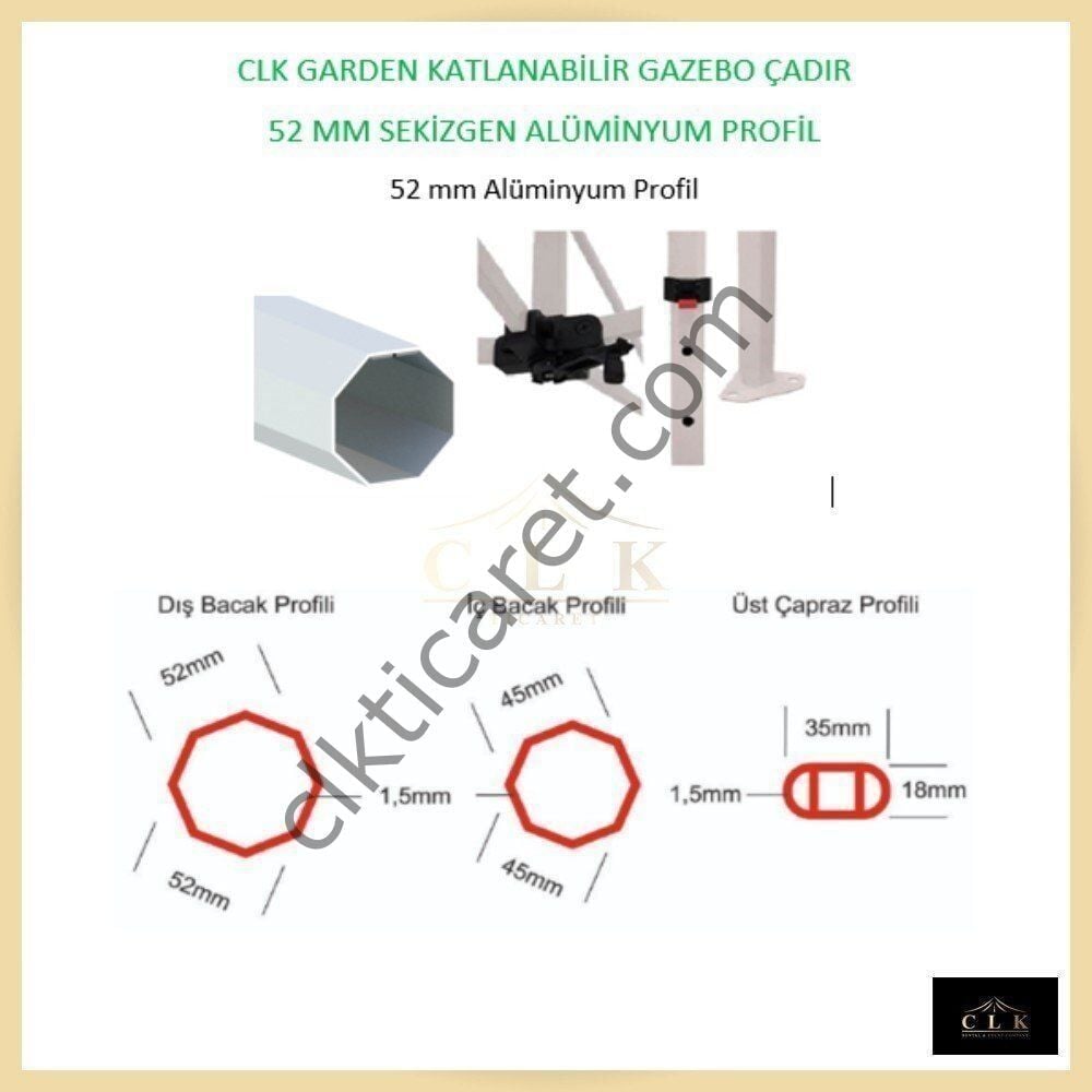 İmalatçı firma CLK TİCARET güvencesi ile su geçirmez, yüksek kalite kumaş ile üretilmiş, branda ve 52 mm sekizgen alüminyum iskelet ve mafsal parçaları garantili katlanabilir gazebo çadırları.